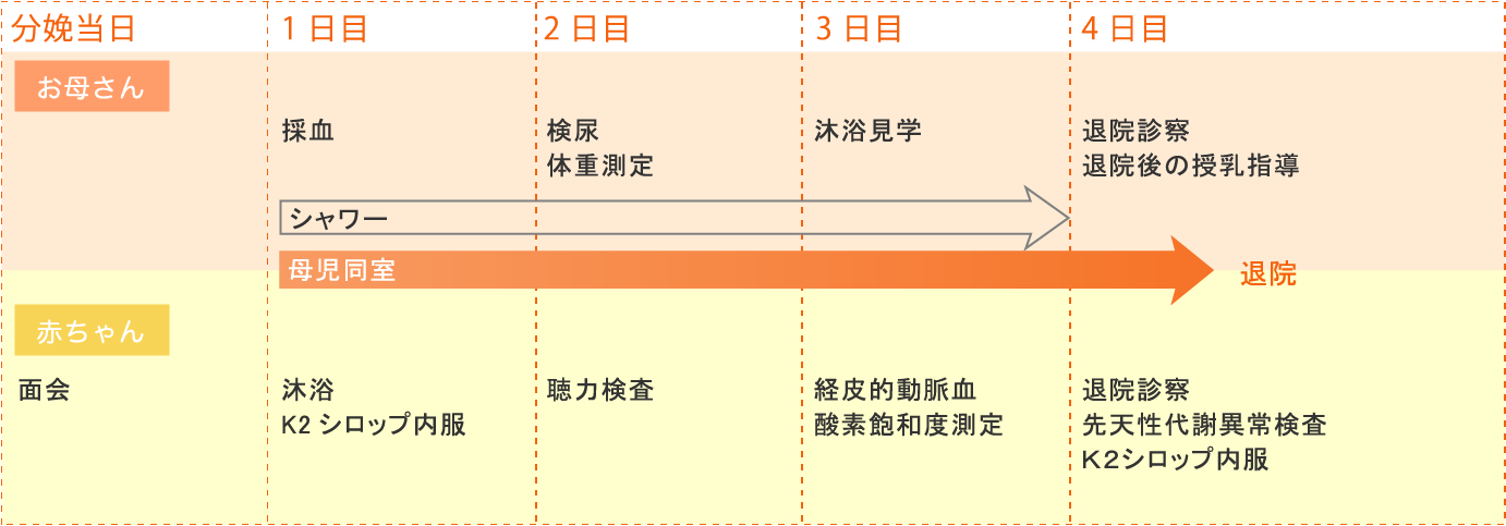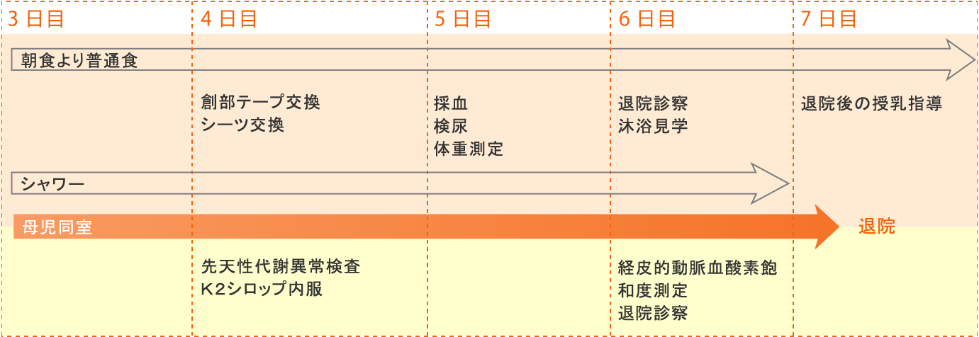 (帝王切開で入院されたお母さんと赤ちゃんのスケジュール)